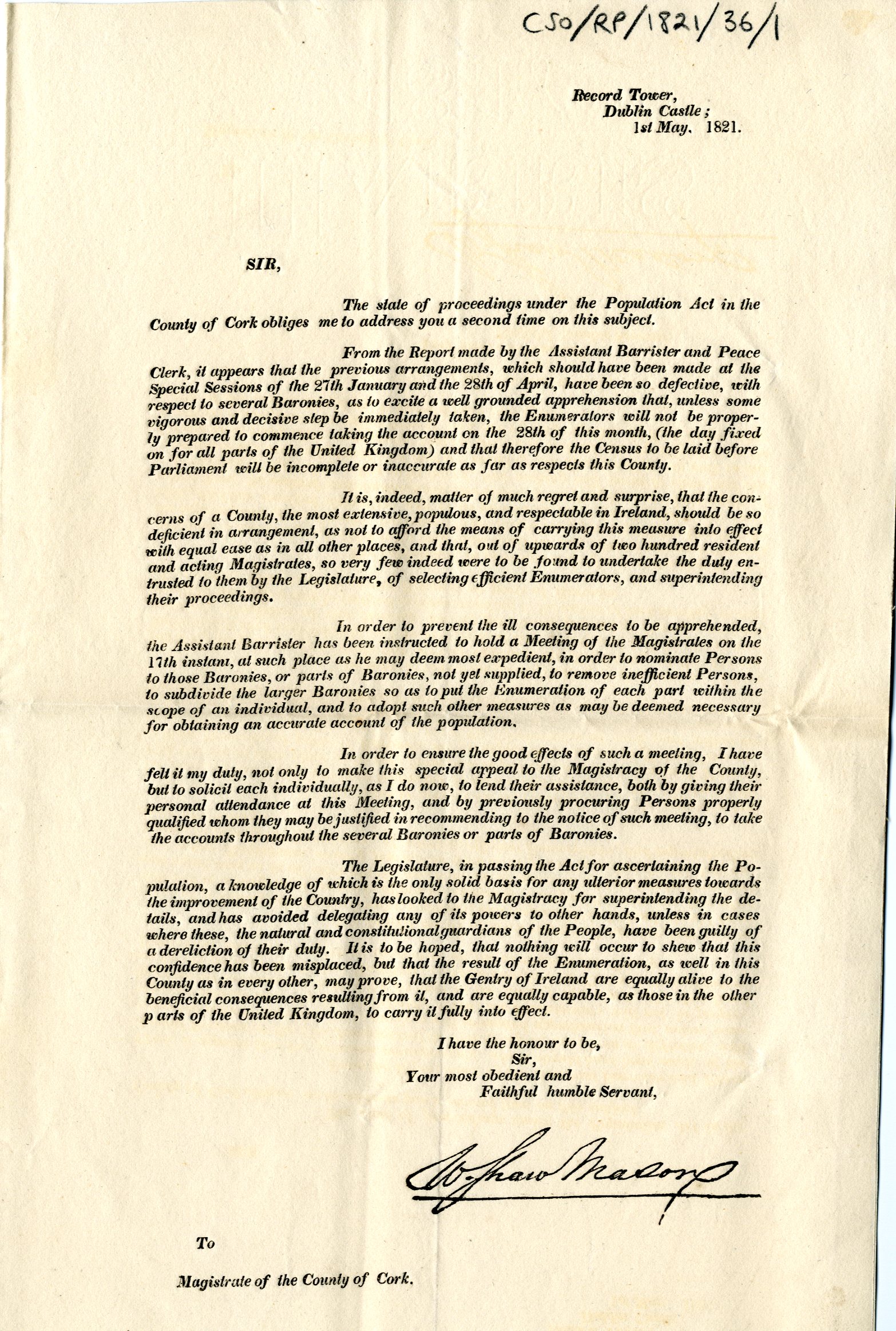 File of papers relating to problems in County Cork with arrangements for 1821 census to be carried out, under terms of the population act. Includes printed letter from William Shaw Mason, secretary of Records Commission, Records Tower, Dublin Castle, to the magistrates of County Cork, concerning ill-preparedness of some of the baronies of County Cork to carry out the census. 'It is, indeed, a matter of much regret and surprise, that the concerns of a County, the most extensive, populous and respectable in Ireland, should be so deficient in arrangement, as not to afford the means of carrying this measure into effect with equal ease as in all other places, and that, out of upwards of 200 resident and acting Magistrates, so very few indeed were to be found to undertake the duty entrusted to them by the Legislature, of selecting efficient Enumerators, and superintending their proceedings', 1 May 1821. |