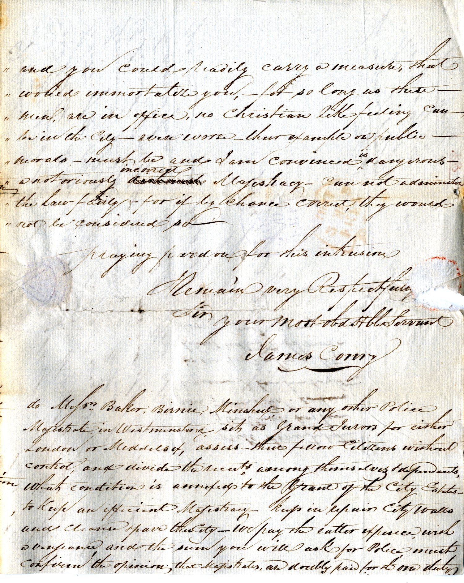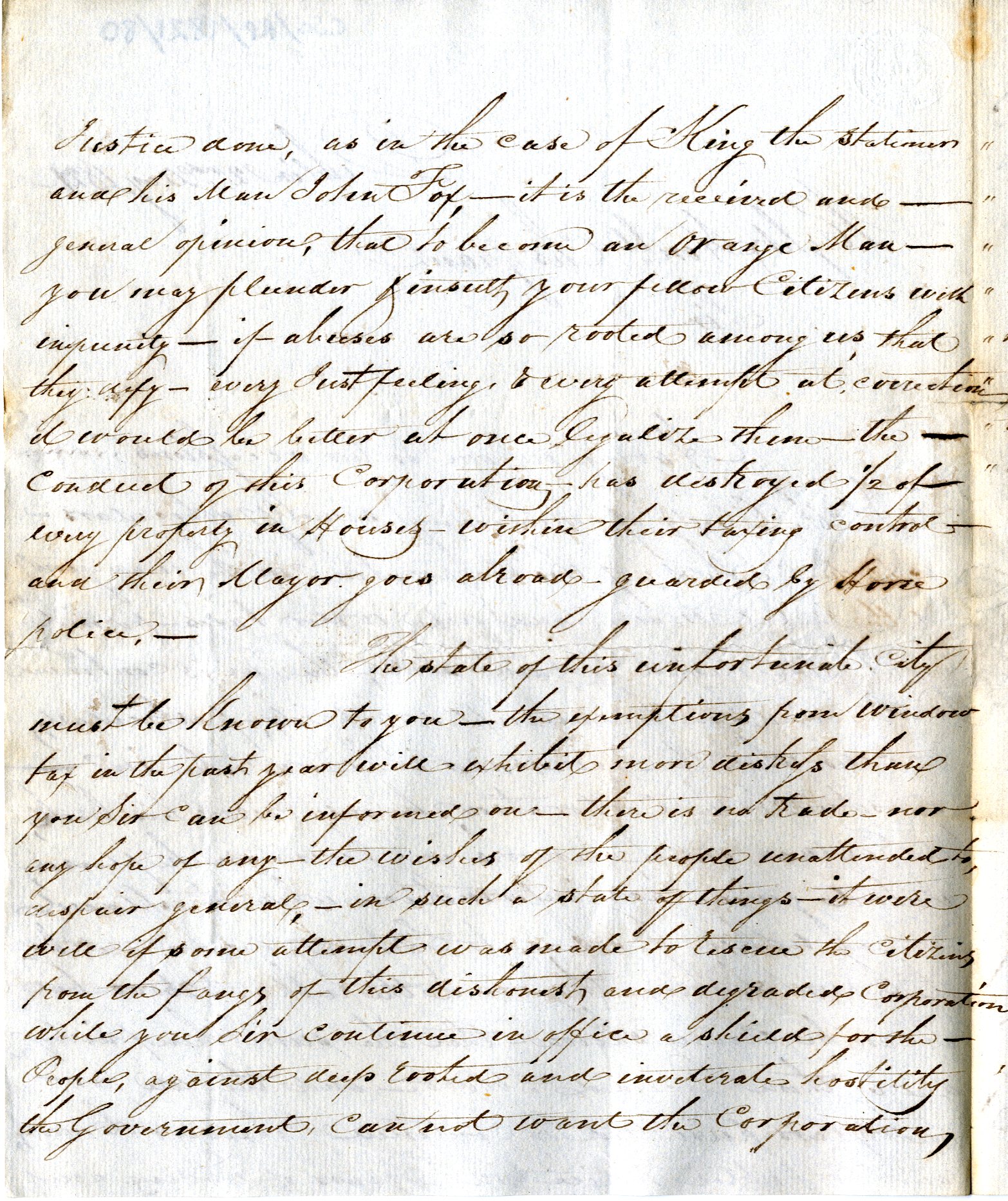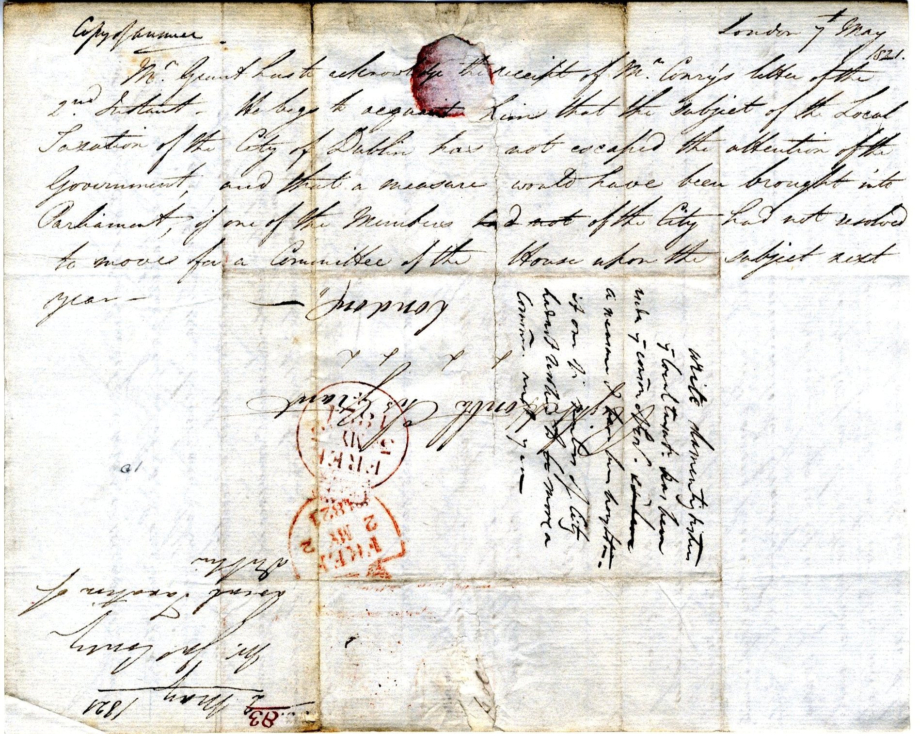 Letter from James Corry, Dublin, to Charles Grant, Chief Secretary, Dublin Castle, concerning Dublin corporation's management of metal main and pipe water taxes. Complains that the tax is 'continued and levied with unexampled rapacity - particularly in cases, when the Householder is known to be in opposition to the Corporation'. Details various allegations, commenting that 'it is the received and general opinion, that to become an Orange Man you may plunder & insult your fellow Citizens with impunity'. Urges government to 'rescue the citizens from the fangs of this dishonest and degraded Corporation', 2 May 1821. Annotation on reverse of draft letter of reply from Grant, London, to Corry, 7 May 1821. |