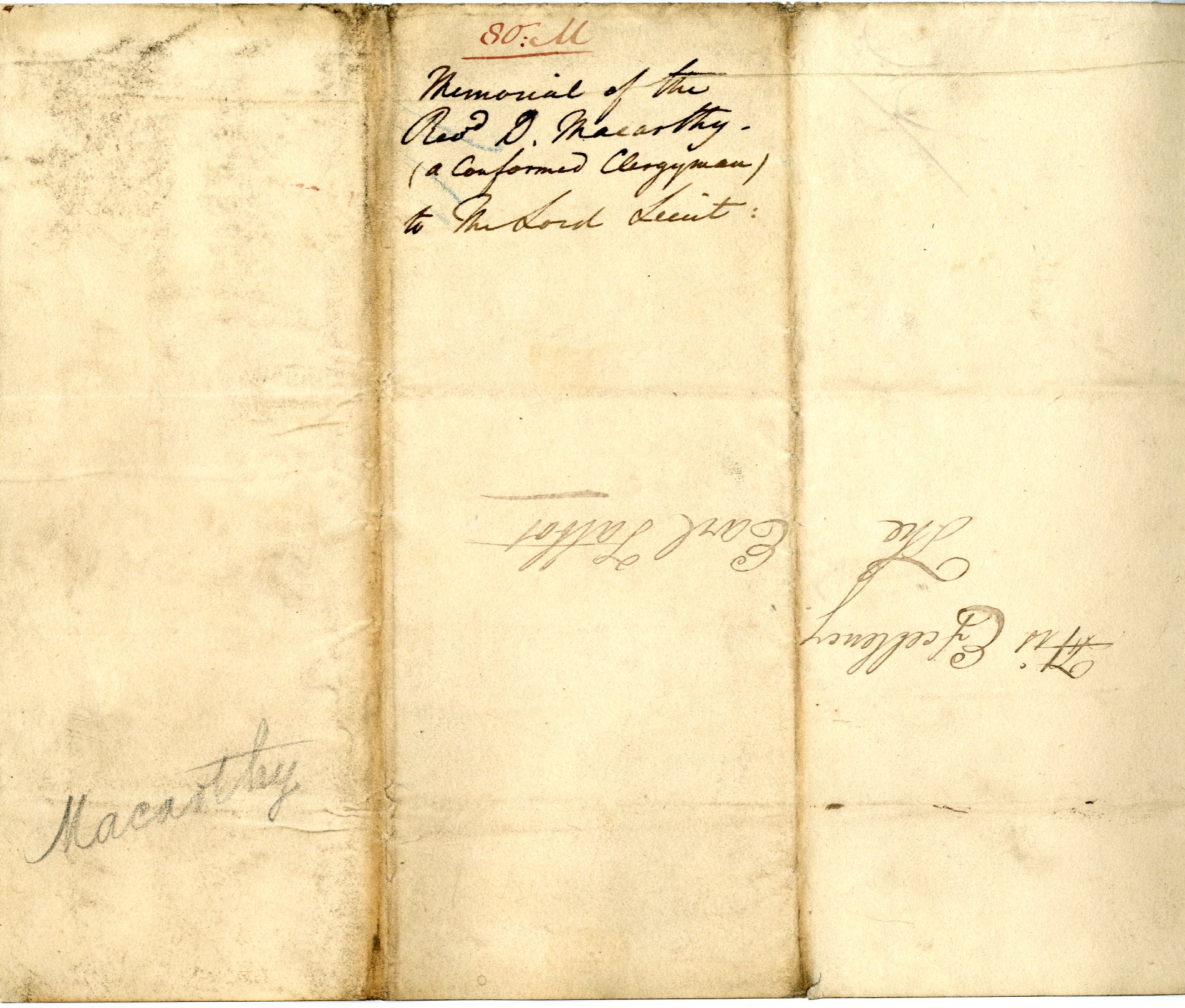 Petition of Reverend Daniel McCarthy, Evergreen, Youghal, County Cork, formerly Roman Catholic priest, later clergyman of the established church, to Earl Talbot, Lord Lieutenant, Dublin Castle, requesting government employment for either of his sons and emphasising the distress of his family's situation, 17 August 1819. Encloses several testimonials in support of his application, vouching for his character and conduct, including William Thompson, Church of Ireland Archdeacon of Cork; and Lord Bantry, 14 April 1801- 18 August 1819. |