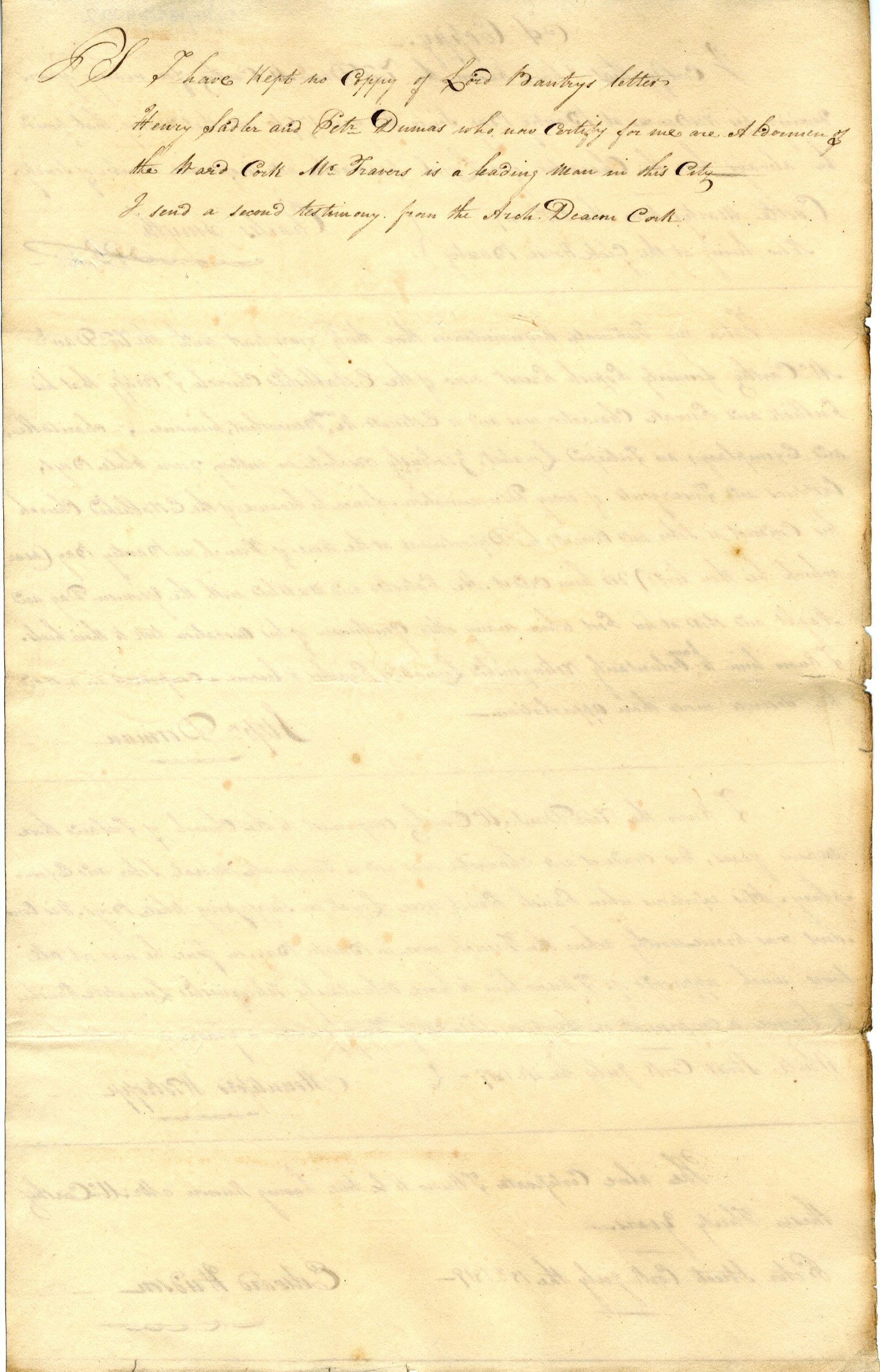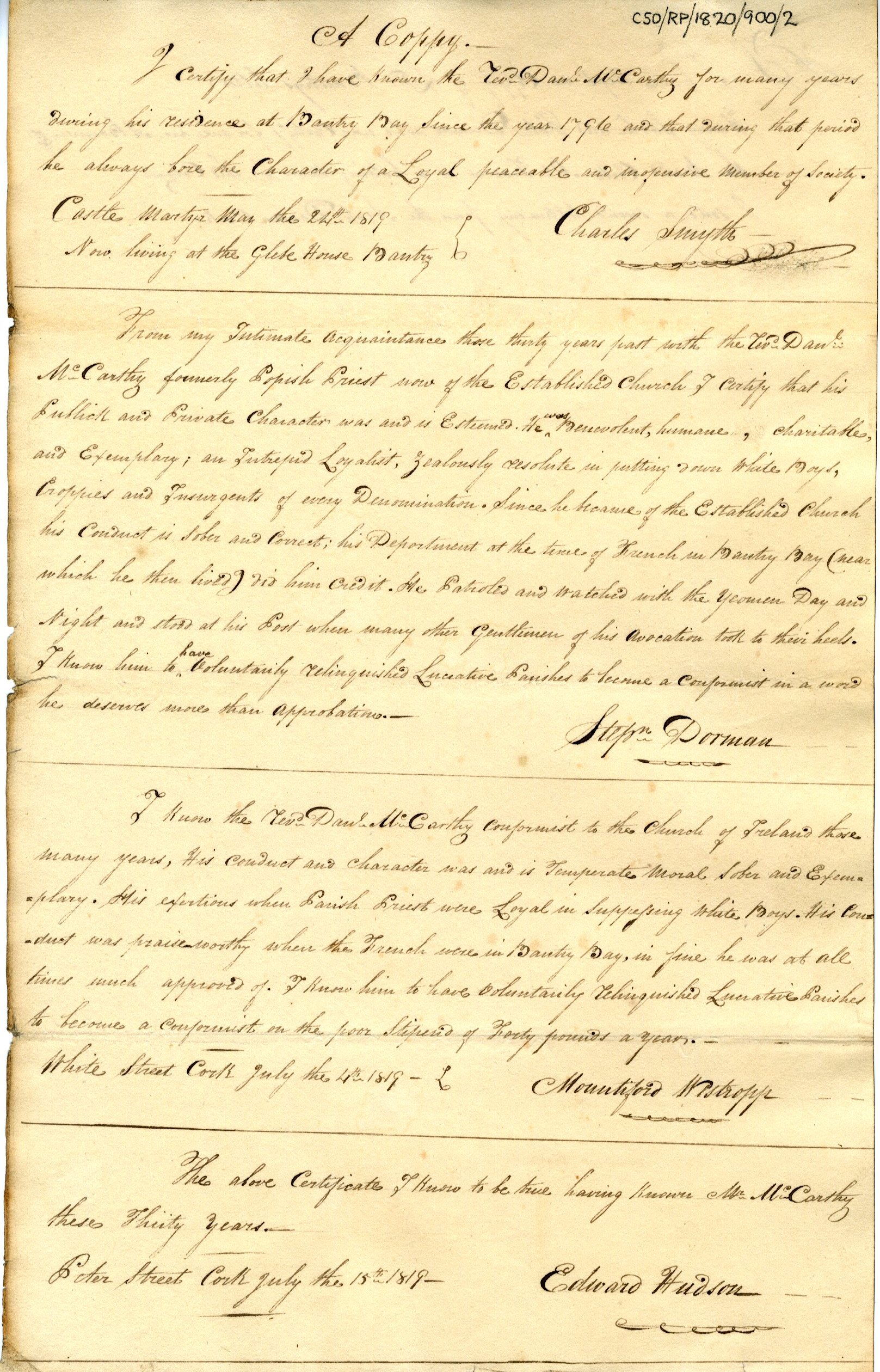 Petition of Reverend Daniel McCarthy, Evergreen street, Cork, County Cork, to Earl Talbot, Lord Lieutenant, Dublin Castle, requesting measure of government relief; encloses copy certificates of character from Stephen Dorman, in support of McCarthy, an ex-Roman Catholic priest who transferred to the established church, whom he describes as ‘an Intrepid Loyalist, Zealously resolute in putting down White Boys, Croppies and insurgents of every Denomination…his Deportment at the time of the French in Bantry Bay (near which he then lived) did him Credit. He Patroled [sic] and watched with the yeomen Day and Night and stood at his Post when many other Gentlemen of his avocation took to their heels’; also includes copy certificates of character from Charles Smyth, Mountiford Westropp, and Edward Hudson; also includes letter of support from William Thompson and original testimonials from ‘Dumas’ and ‘Travers’. |