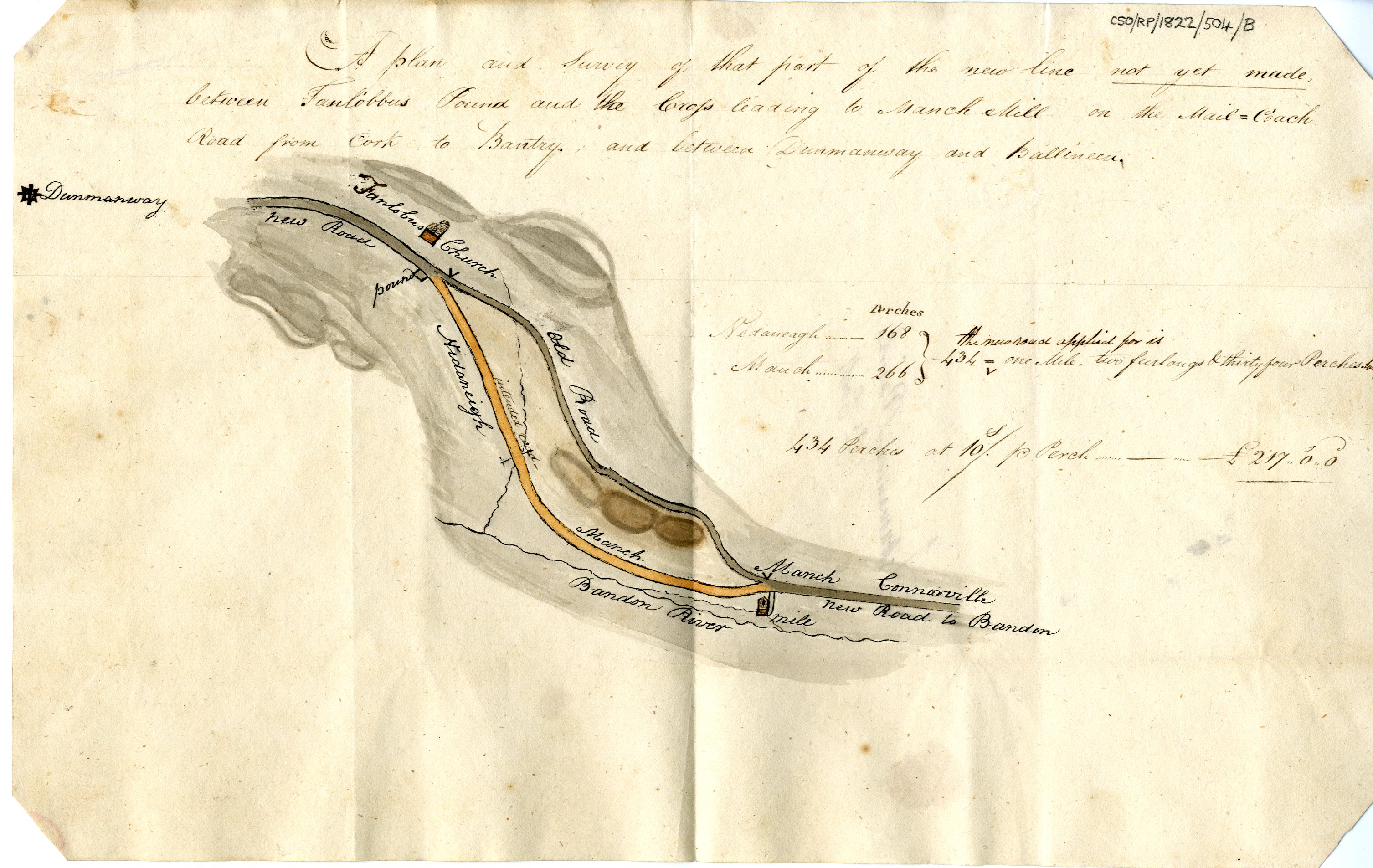 Letter from Herbert Gillman, Woodbrook, Dunmanway, County Cork, to Chief Secretary’s Office, Dublin Castle, enclosing memorial of residents of County Cork, to Richard Wellesley, 1st Marquis Wellesley, Lord Lieutenant, Dublin Castle, requesting that an engineer be directed to inspect a new line of road leading from Crookstown, in the parish of Moviddy, to Kealkil in the parish of Bantry, incorporating Ballilickey, Coosane and other parishes, and that financial assistance might be forthcoming to complete the proposed scheme: claims that such an initiative would offer employment to those without and would provide access to law and order in the region; signed by Lord Bantry and 31 supporters; also encloses detailed hand coloured map and estimate of proposed works, by Jeremiah O’Brien. |